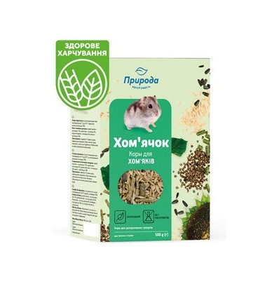 Рецептура корму Хом'ячок розроблена на основі рекомендацій провідних фахівців із розведення дрібних гризунів. Корм містить усі інгредієнти, необхідні для розвитку молодих тварин і для гарної кондиції дорослих. Крім зерна корм містить смакові добавки (горіхи), вітаміни (А, В1, В2, D3, Е, Н), а також мінеральні речовини: солі кальцію, фосфору, калію, натрію, якими багаті просо, гречка, овес і пшениця. Не забувайте додавати до раціону вашого улюбленця ласощів ТМ Природа.